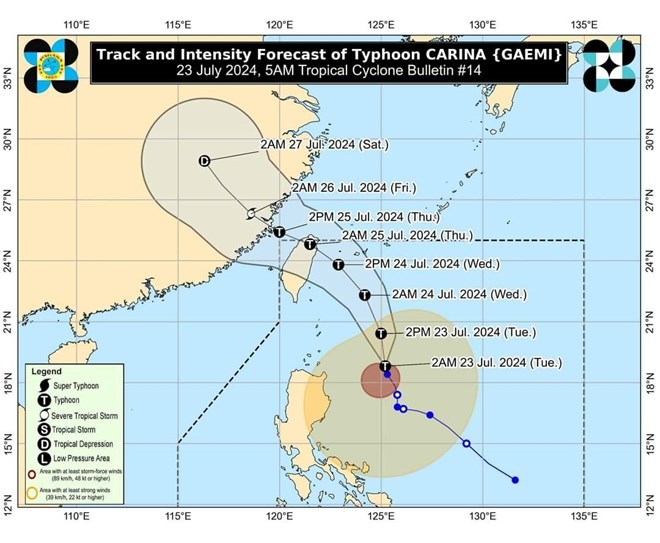 Bản tin dự báo bão của Cơ quan Quản lý Khí quyển, Địa vật lý và Thiên văn Philippines (PASAGA) hồi 5h00 ngày 23/7/2024 cho biết, bão Gaemi (tên địa phương là Carina) duy trì sức mạnh khi di chuyển theo hướng tây tây bắc.