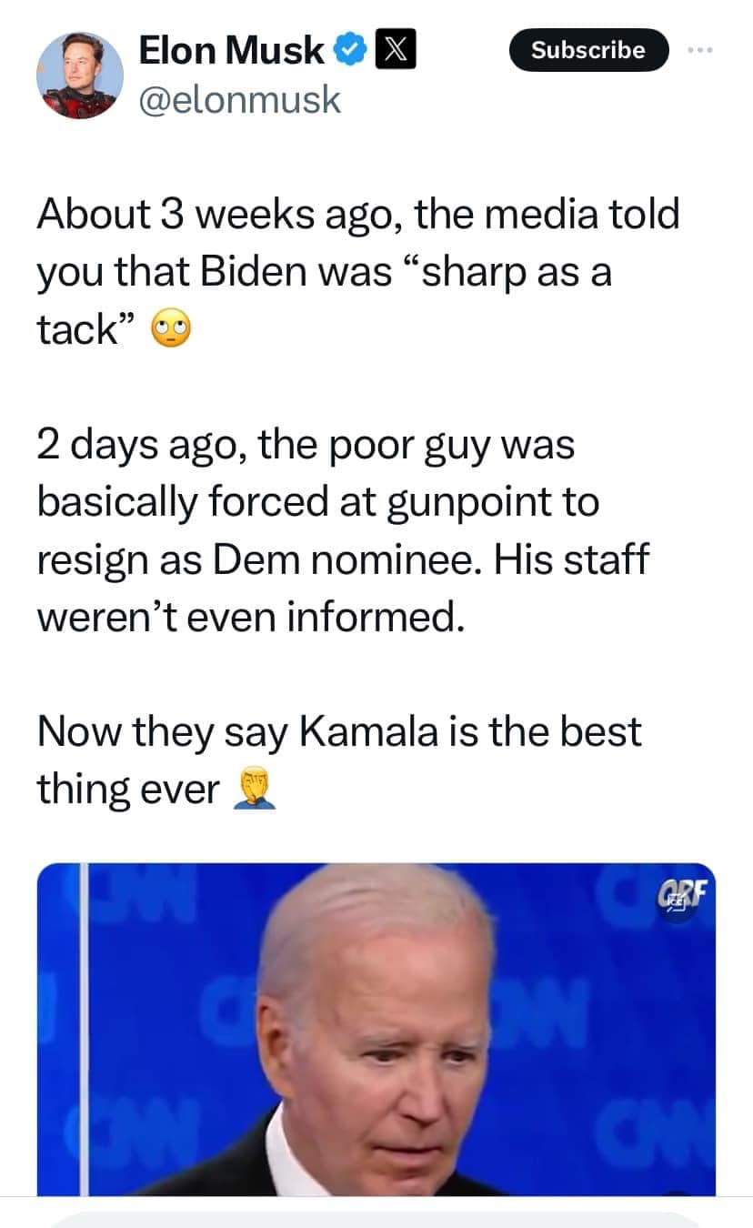 Phần nữa anh Elon cũng chơi ngặt. Anh hỏi báo chí mới mấy tuần trước bơm hơi anh Bảy “ tao phẻ có răng mô . “ Đột nhiên bây giờ xuống ghế thì éo có thằng nào nói tới. Giờ quay qua Kamala nói chị tui hạng nhất chưa ai qua.
