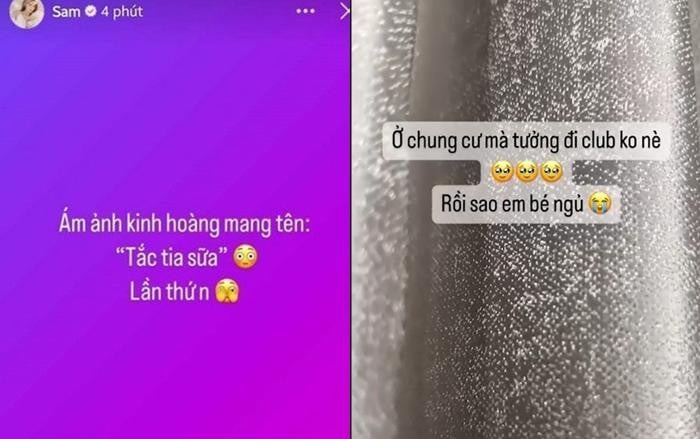 Mới đây, Sam có chia sẻ về chuyện chăm sóc hai con, nhanh chóng nhận được sự quan tâm của nhiều người. Cụ thể, mẹ bỉm 2 con than thở: "Ám ảnh kinh hoàng mang tên 'tắc tia sữa' lần thứ n". Không chỉ vậy cô còn ám ảnh khi hàng xóm mở nhạc quá lớn gây ảnh hưởng đến giấc ngủ của hai con nhỏ. Chia sẻ của Sam được nhiều người thông cảm, đặc biệt là những mẹ bỉm nuôi con nhỏ.