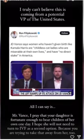 Những bình luận mà ứng cử viên phó tổng thống của đảng Cộng hòa JD Vance đưa ra cách đây nhiều năm về những người không có con đã xuất hiện trở lại trên mạng và thu hút sự chú ý của nữ tài tử Jennifer Aniston. Theo KTLA, bà Aniston đã đăng một đoạn video clip trên Instagram Story trong buổi phỏng vấn giữa ông Vance và Fox News. Trong Video, ông Vance nói rằng Hoa Kỳ đang bị điều hành bởi “một nhóm những người không con, không hạnh phúc với cuộc sống của chính họ và những lựa chọn mà họ đã đưa ra, và vì vậy họ muốn toàn bộ Hoa Kỳ cũng phải đau khổ như họ.” Sau đó, ông Vance đề cập đến bà Kamala Harris, ông Pete Buttigieg, và bà Alexandra Ocasio-Cortez. Đoạn clip hiện đang lan truyền rộng rãi này được ông Ron Filipkowski, Tổng biên tập của Meidas Touch, đăng trên X. Trong bài đăng, bà Aniston đã chỉ trích những bình luận của ông Vance. Nữ tài tử này, người thường rất kín tiếng về các mối quan hệ của mình, đã nói về việc bản thân có con vào năm 2022 với tạp chí Allure. Bà tiết lộ bà đã cố gắng có con suốt từ những năm bà 30 đến 40 tuổi, và đó là một chặng đường đầy thử thách. Bà cho biết bà đã phải dùng đến phương pháp thụ thai ống nghiệm IVF để có con, và bà cầu chúc con gái ông JD Vance có khả năng sinhcon, trong khi chính ông JD Vance đã chống lại cả việc thụ thai bằng ống nghiệm IVF.