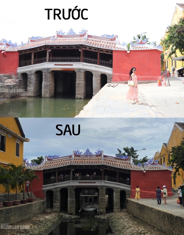 Ngày 30-7, đơn vị thực hiện dự án tu bổ di tích Chùa Cầu đã tiến hành tô quét một lớp vôi màu nhụ lên phần thành cầu để di tích trở nên sẫm màu hơn, vơi đi cảm giác tươi mới hơn so với trước đó.