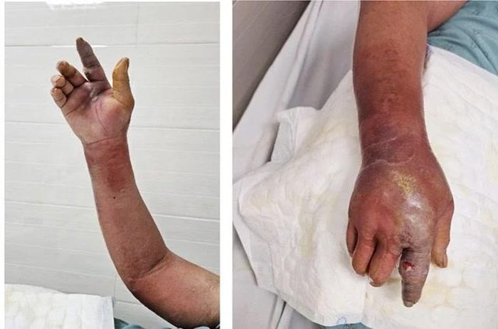Sau 5 ngày, bệnh nhân xuất hiện sưng nề mu bàn tay phải, đau nhức nhiều, phần sưng nề lan nhanh lên cẳng tay, cánh tay, kèm theo sốt nóng, gai rét.