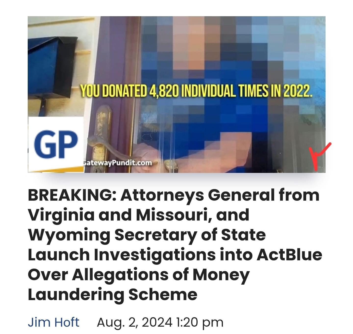 Tổng chưởng lý của Virginia và Missouri, cùng với Bộ trưởng Nội vụ của tiểu bang đã điều tra các vụ rửa tiền cho tổ chức gây quỹ cho đảng cộng sản dâm chủ, Act blue, vì chúng đã sử dụng tên tuổi của những người không/chưa bao giờ ủng hộ tiền cho act blue đó với những số tiền nhiều hơn gấp mấy lần cho phép. Nhất là có thông tin của những người không có việc làm mà lại có số tiền ủng hộ rất cao.