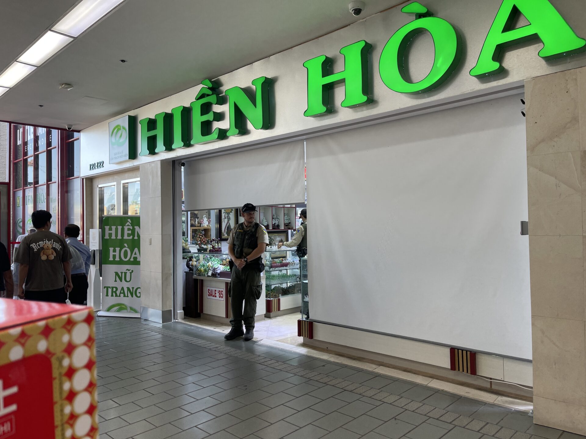 Nhân viên CDFW đứng trước cửa hàng thứ nhì của tiệm vàng Hiền Hòa trong thương xá Phước Lộc Thọ. (Hình: Đỗ Dzũng/Người Việt)
