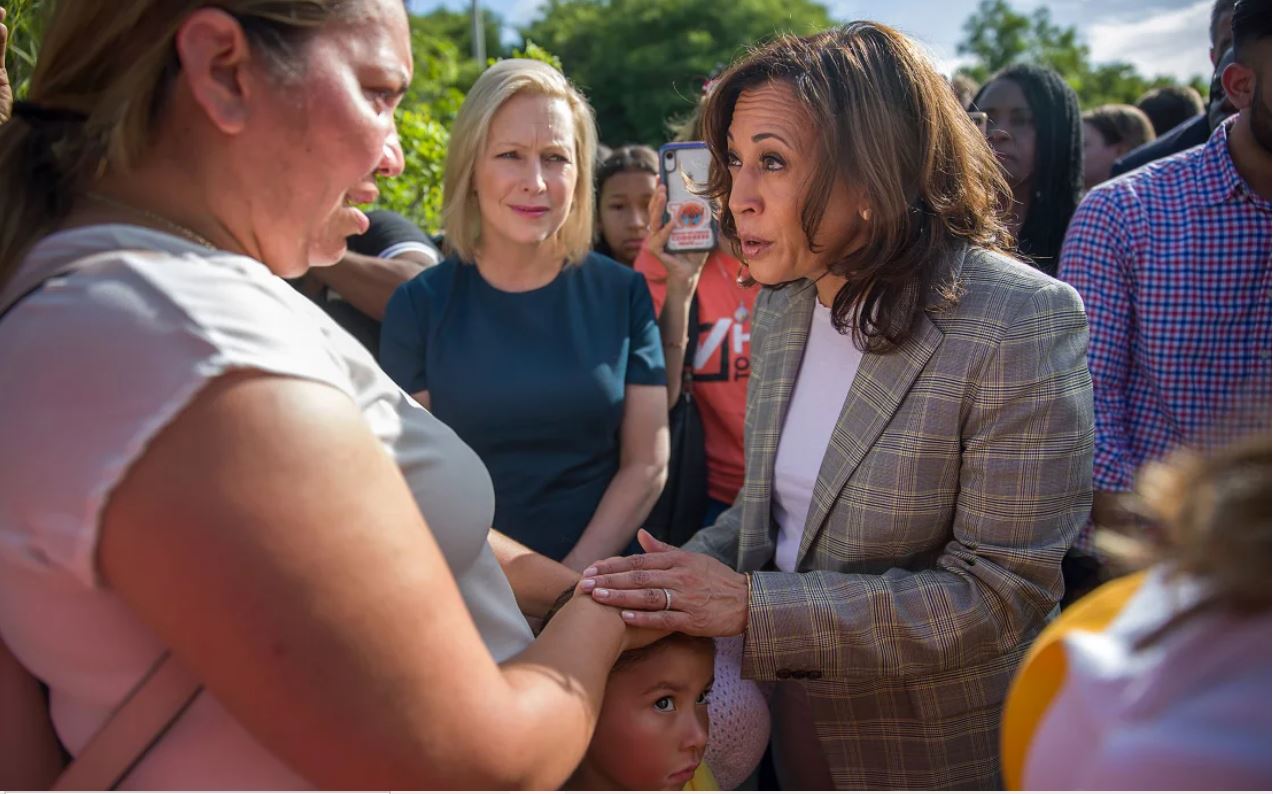Thượng nghị sĩ Kamala Harris và Thượng nghị sĩ Kirsten Gillibrand trò chuyện với Lili Montalban và con gái bà là Roxanna Gozzer khi họ đến thăm bên ngoài một trung tâm giam giữ trẻ em di cư vào ngày 28 tháng 6 năm 2019 tại Homestead, Florida.