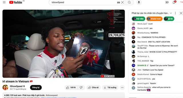 Buổi livestream trên kênh YouTube IshowSpeed đến tối 14-9 thu hút gần 4,1 triệu lượt xem với hơn 4.100 bình luận.