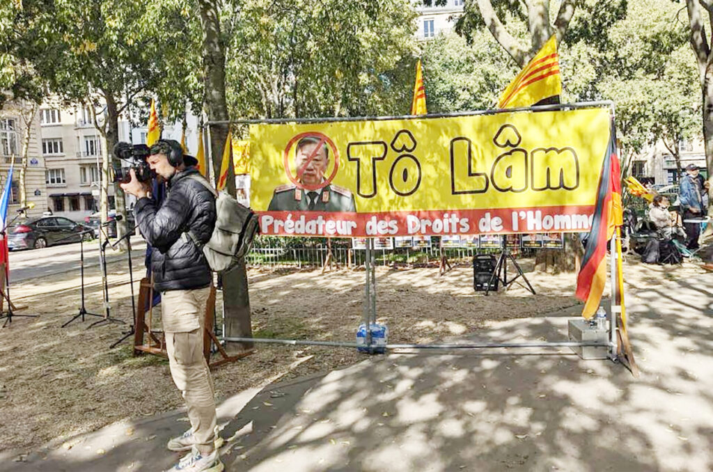 Một biểu ngữ bằng tiếng Pháp tại cuộc biểu tình lên án ông Tô Lâm là “kẻ tiêu diệt quyền con người,” phản ánh sự phẫn nộ của cộng đồng người Việt tại Âu Châu trước những chính sách đàn áp nhân quyền của chính quyền Việt Nam. Cuộc biểu tình này do 18 hội đoàn, tổ chức người Việt yêu tự do tại Pháp tổ chức, với lời kêu gọi người Việt từ khắp nơi trên châu Âu tụ tập về Paris để lên tiếng phản đối chính sách kiểm soát tự do ngôn luận, đàn áp các phong trào nhân quyền, và duy trì chế độ độc đảng ở Việt Nam.