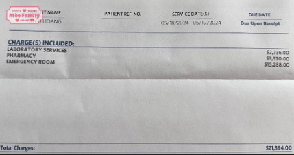 Lúc đó anh Tiến nguy kịch nên vào viện, dù chỉ nằm viện có mấy tiếng đồng hồ thôi nhưng họ vẫn tính tiền viện phí. Hóa đơn tôi nhận được là 23 nghìn đô. Tức là tôi sẽ phải trả 23 nghìn đô này cho bệnh viện.