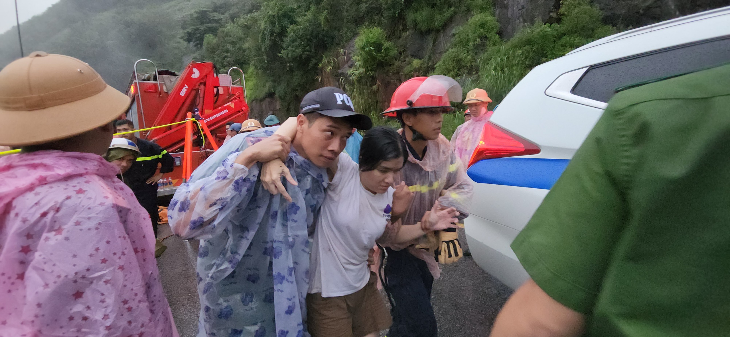 Trần Nguyễn Thu Trang được lực lượng chức năng đưa từ vực sâu lên sau vụ tai nạn.
