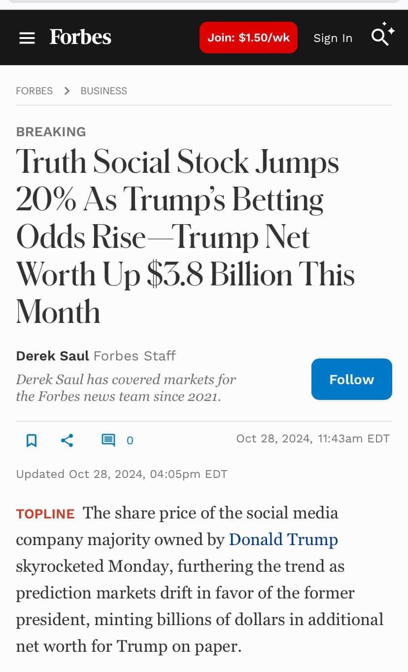 Trước khi Elon vận động cho ông Trump giá DJT chỉ có $11.75. Từ ngày Elon chính thức nhập cuộc đến nay DJT đă lên đến 500%, một con số không tưởng trong ṿng 1 tháng.