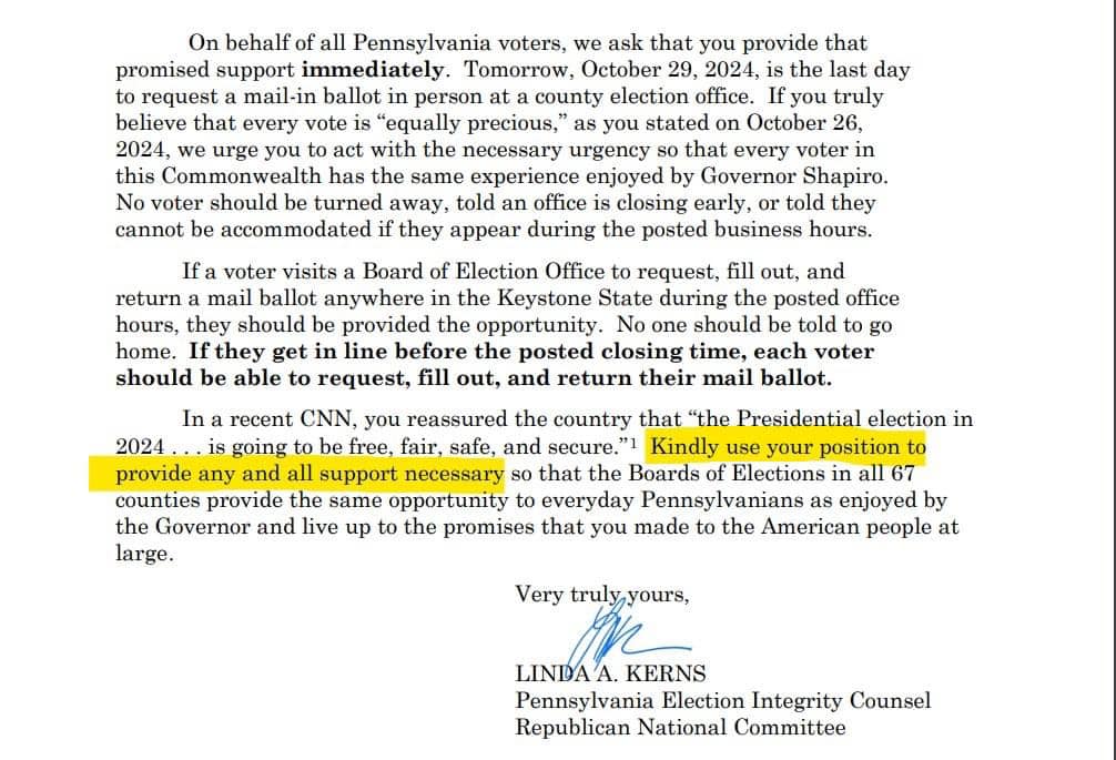 Luật sư của đảng cộng hoà đă gửi thư phản đối tới quan chức Pennsylvania nói rằng cử tri đang bị từ chối tại các điểm bỏ phiếu "Cử tri liên tục báo cáo với chúng tôi... họ được thông báo rằng "máy tính bị hư", trang web sẽ đóng cửa sớm, họ không chấp nhận thêm cử tri nữa và các lá phiếu qua thư sẽ không được tính...".