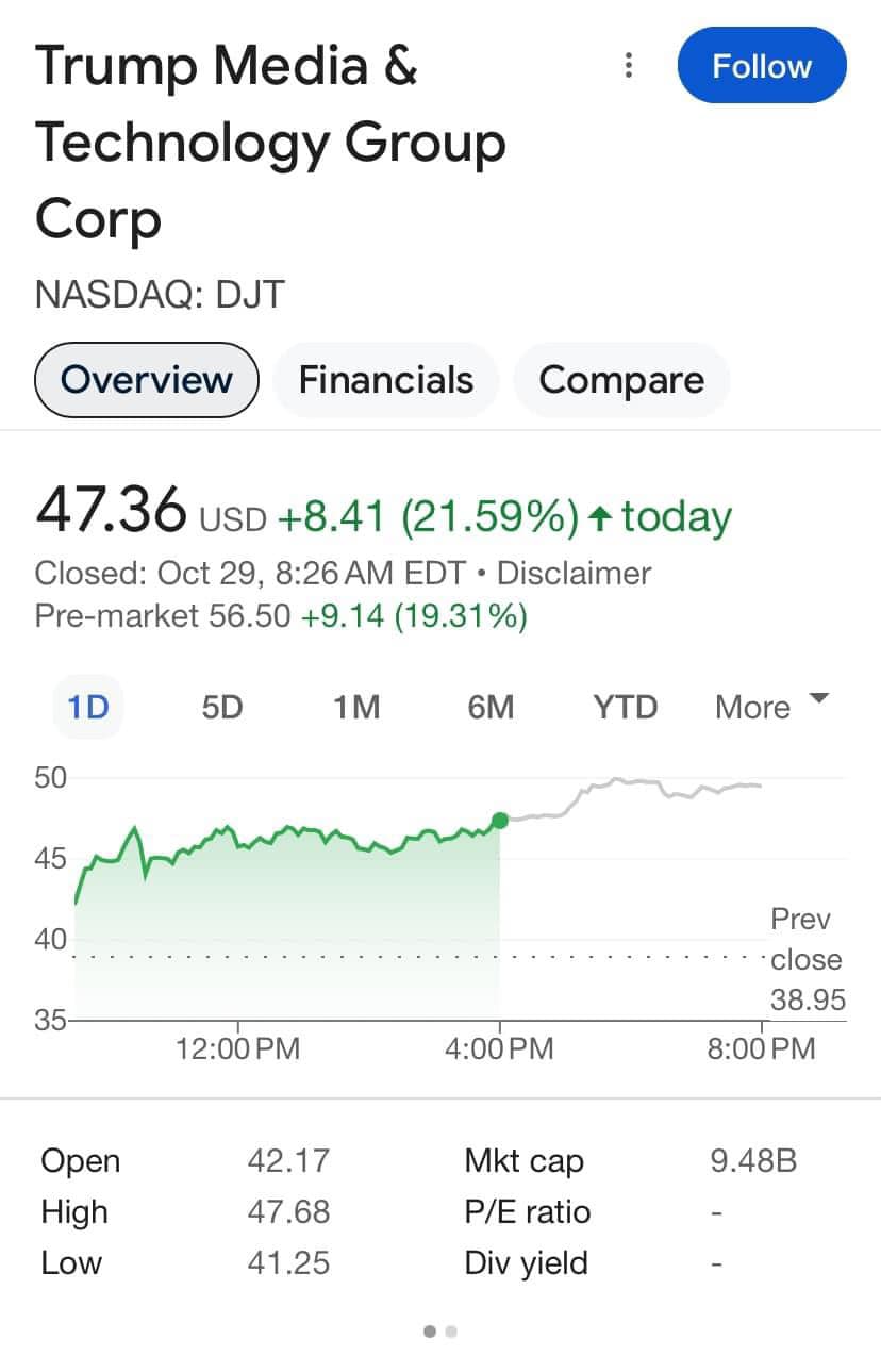 Sáng hôm qua DJT có giá là $42.17 th́ sáng hôm nay đă lên đến $56.50 .