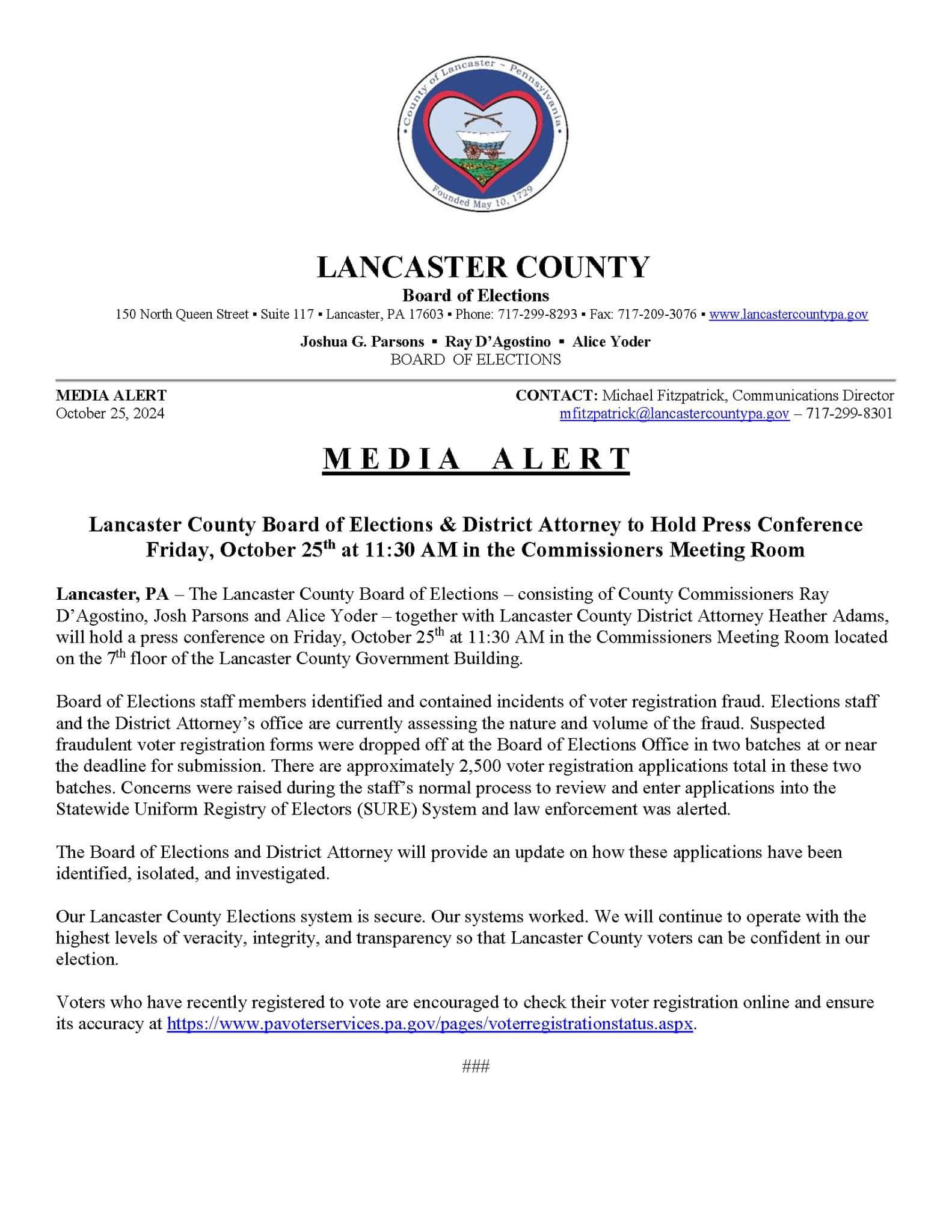 Sáng hôm nay , các quan chức bầu cử ở Quận York, Pennsylvania, báo cáo rằng họ cũng đă nhận được hàng nghìn đơn của cử tri, xin bỏ phiếu qua thư có khả năng gian lận. Hai hôm trước, các quan chức cũng đã có báo cáo gian lận ghi danh bỏ phiếu ở Quận Lancaster, và bây giờ là Quận York trong tiểu bang Pennsylvania.