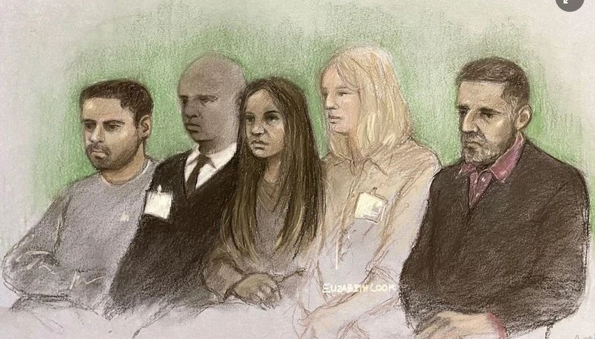 Bản phác thảo của họa sĩ tòa án về các bị cáo, từ trái sang phải, Faisal Malik, Beinash Batool và Urfan Sharif. Ảnh: Elizabeth Cook/PA.