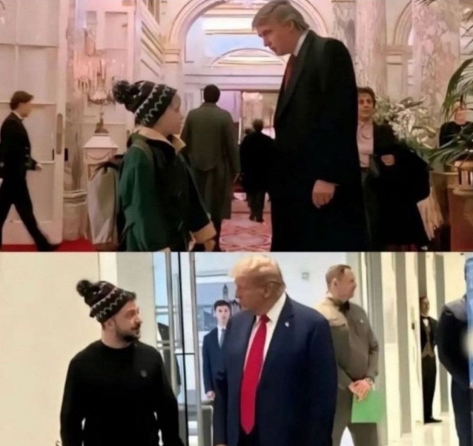Tài khoản mạng xã hội Jack Poso đã chế ảnh cuộc gặp giữa Tổng thống Ukraine Volodymyr Zelensky và ông Trump tuần này tại Paris với phân cảnh trên, trong đó ông Zelensky bị ghép đội chiếc mũ len giống cậu bé Kevin.