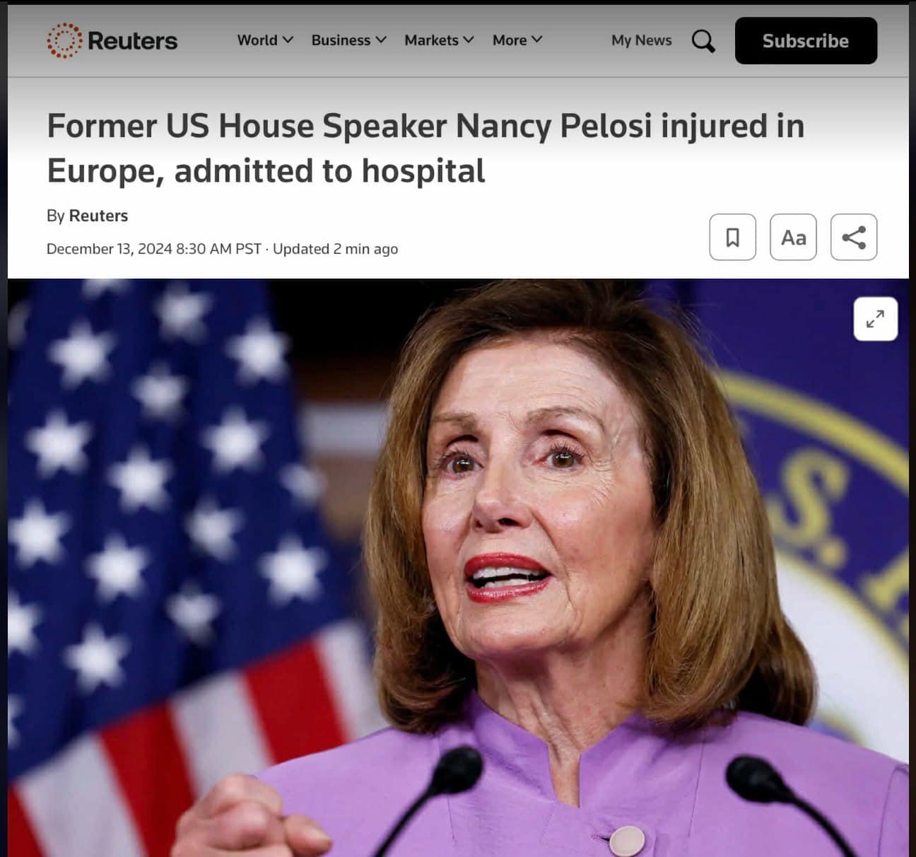 Thứ sáu ngày 13/12 , trong một tuyên bố vào sáng nay: Ian Krager trưởng văn pḥng của bà Cựu Chủ tịch Hạ viện Hoa Kỳ Nancy Pelosi cho biết Bà Nancy Pelosi 84 tuổi,khi đi công tác cùng phái đoàn lưỡng đảng của Quốc hội Mỹ tại Luxembourg để kỷ niệm 80 năm Trận chiến Bulge , bà đă bị thương, đă được đưa vào bệnh viện .Hiện bà Nancy Pelosi đang được các bác sĩ và chuyên gia y tế điều trị rất tốt , nhưng bà vẫn tiếp tục làm việc".
