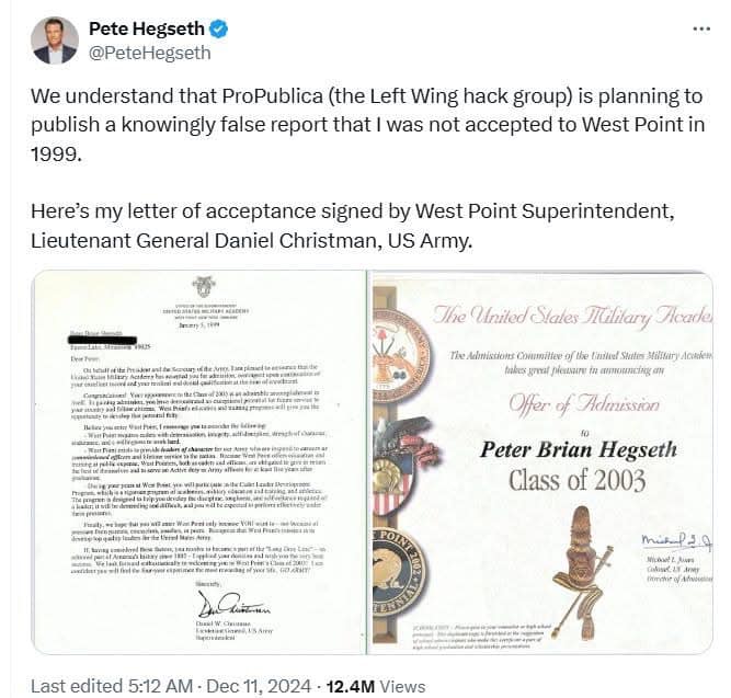 Theo báo này, ông Pete Hegseth trong một buổi nói chuyện đã nói ông được nhận vào trường West Point, nhưng khi báo Propublica hỏi trường West Point thì phát ngôn nhân của trường nói không có hồ sơ gì của ông cả. Ông không nạp đơn cũng không được trường nhận. Báo Propublica sau khi viết bài ,thì email cho luật sư của ông Hegseth trong vòng 1 giờ phải trả lời về việc này, nếu không sẽ đăng tin ông Pete Hegseth nói láo.