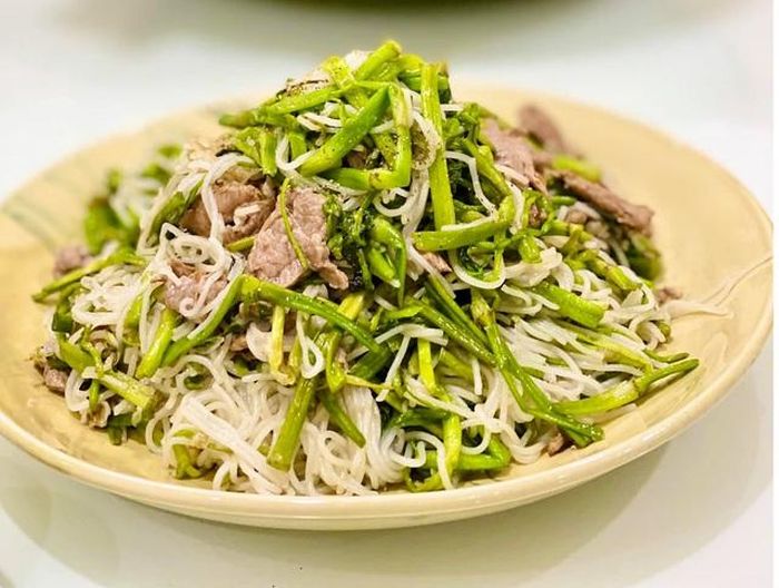 phi tỏi thơm cho cần vào chảo xào lửa to, nhanh tay đảo cần, nêm gia vị vừa ăn. Khi cần chín tái thì bỏ bún vào đảo nhanh tay, cho tiếp thịt bò vào đảo đều. Cho bún ra đĩa, bạn cho thêm hạt tiêu ăn ngay và thêm xì dầu, ớt tươi.