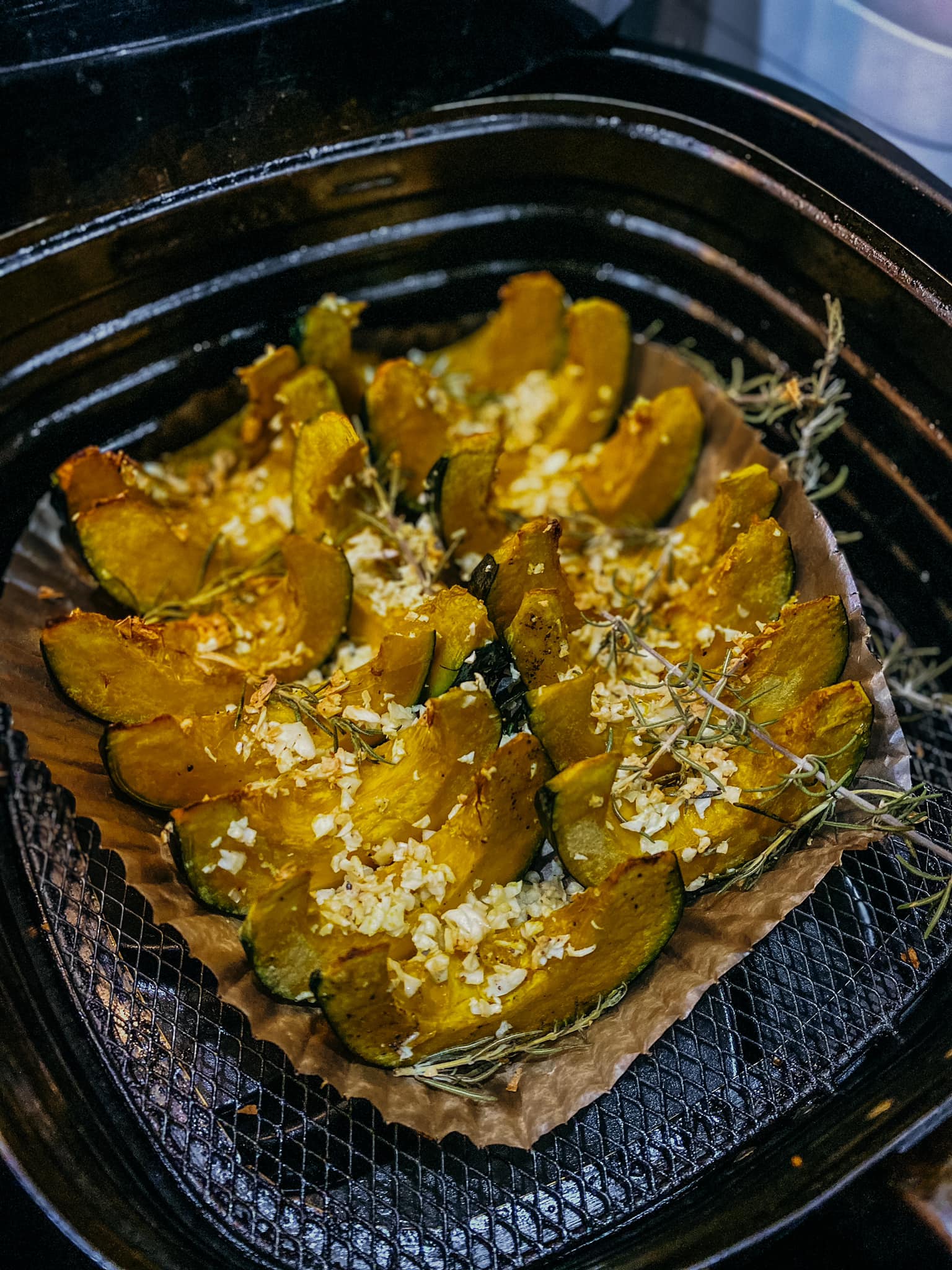 - Sau khi bí đã chín, rắc lá hương thảo tươi lên trên vài phút trước khi lấy ra khỏi lò.