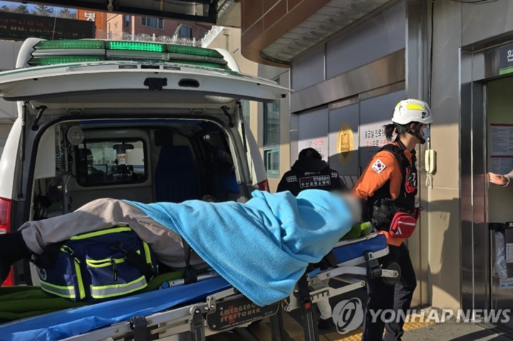 Một trong hai người sống sót được đưa đến bệnh viện đa khoa ở thành phố Mokpo ngày 29/12. (Ảnh: Yonhap)
