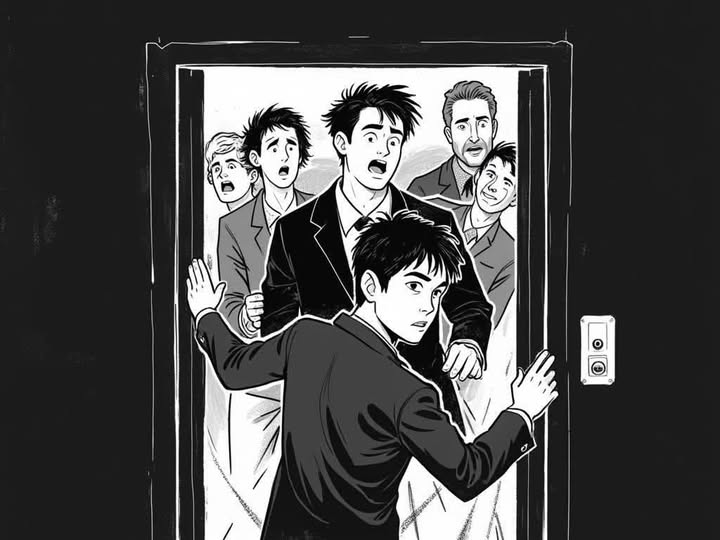 Trong khoảnh khắc trước khi cửa thang máy đóng lại, Cường vội vàng chen vào được. Thang máy vừa khởi động thì đột ngột dừng lại, khiến mọi người bên trong hoảng loạn. Tiếng thở dồn dập, ánh mắt lo lắng, và những lời thì thầm sợ hãi vang lên khắp không gian chật hẹp. Chỉ có Cường giữ được bình tĩnh, cố gắng trấn an mọi người.