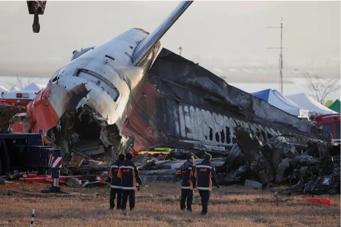 Lính cứu hỏa xem xét đống đổ nát của chiếc máy bay bị rơi sau khi trượt khỏi đường băng tại sân bay quốc tế Muan, Muan, Hàn Quốc hôm 31/12. Ảnh: Reuters.