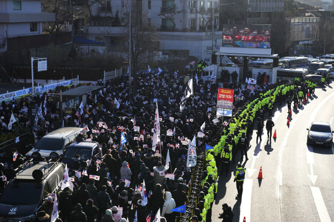 Hơn 1.200 người ủng hộ ông Yoon tập trung bên ngoài dinh thự của Tổng thống, chỉ trích lệnh bắt "không hợp pháp và vô giá trị". Họ giơ những biểu ngữ kêu gọi bắt lãnh đạo phe đối lập Lee Jae-myung.