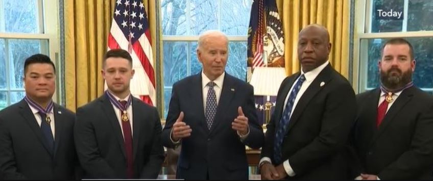 Tổng Thống Joe Biden trao Huân Chương Dũng Cảm cho một trung sĩ thuộc Sở Cảnh Sát Lincoln LPD từng nhảy xuống một cái ao lạnh giá hồi Tháng Hai 2023 cứu mạng một người phụ nữ thoát cảnh chết đuối trong xe hơi.