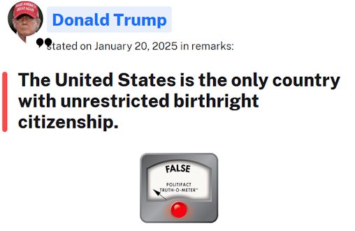 This is incorrect. Around three dozen other countries offer automatic citizenship to children born within their borders, regardless of their parents’ immigration status.