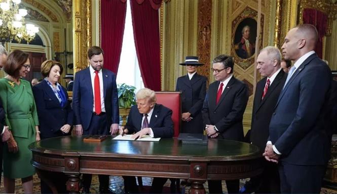Tổng thống Mỹ Donald Trump (thứ 4, trái) ký sắc lệnh hành pháp ngay sau lễ nhậm chức, tại Nhà Trắng ở Washington DC., ngày 20/1/2025.