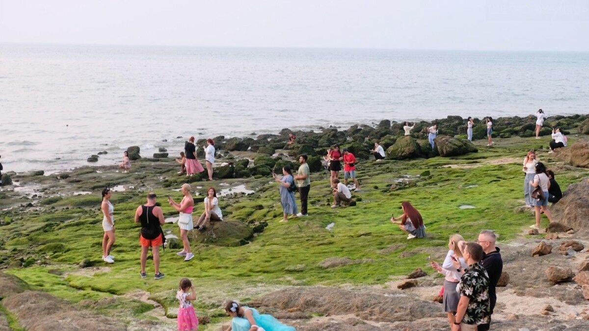 Hiện tượng đặc biệt này xảy ra khi thủy triều rút, để lộ những tảng đá phủ đầy tảo xanh mướt, khiến khu vực trông giống như một đồng cỏ giữa lòng biển. Đây là một sự kiện hiếm hoi, chỉ xuất hiện một đến hai lần mỗi năm và thường kéo dài khoảng một đến hai tuần trước khi tảo khô héo.