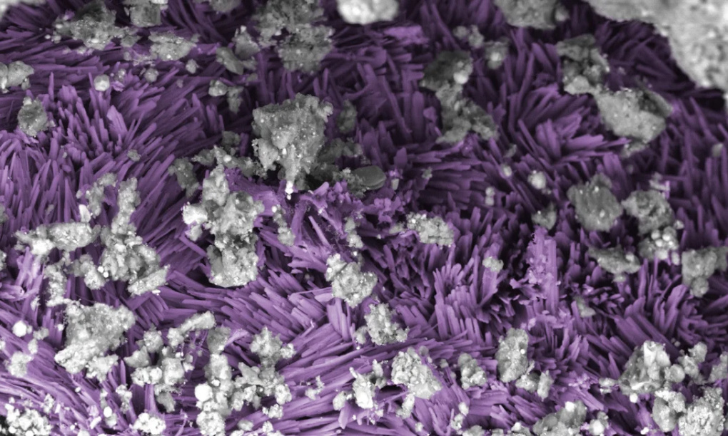 Một mạch natri cacbonat trông giống những chiếc kim, được tô màu tím để dễ hiển thị, bên trong mẫu vật tiểu hành tinh Bennu. Mỗi chiếc kim rộng chưa đến 1 micromet. Ảnh: Rob Wardell/Tim McCoy/Smithsonian