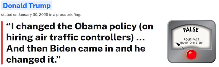 A close look at the FAA’s hiring policies under Obama, Biden and Trump shows that Trump mischaracterized the policies and misled about his actions and the actions of his White House predecessors. He also provided no evidence these policies had any connection to the fatal crash.
