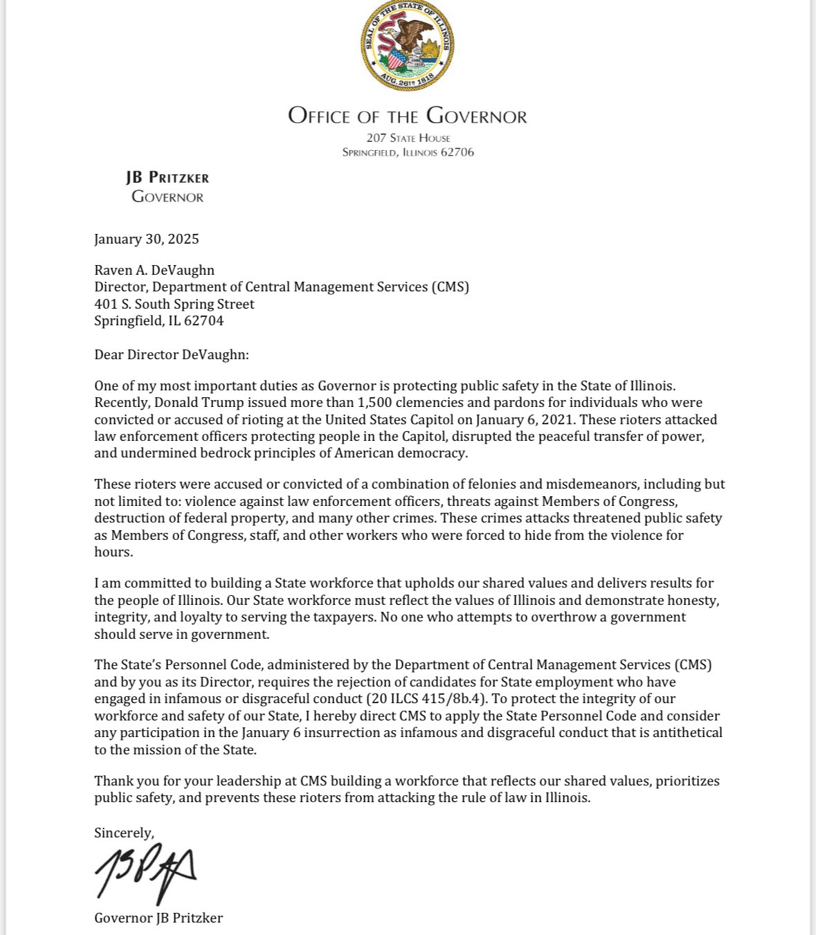 Bộ luật Nhân sự của Tiểu bang, do Sở Dịch vụ Quản lý Trung ương (CMS) và do ngài với tư cách là Giám đốc quản lý, yêu cầu từ chối các ứng viên xin việc tại Tiểu bang đã có hành vi đáng xấu hổ hoặc đáng nhục nhã (20 ILCS 415/8b.4). Để bảo vệ sự toàn vẹn của lực lượng lao động và sự an toàn của Tiểu bang, tôi xin chỉ đạo CMS áp dụng Bộ luật Nhân sự của Tiểu bang và coi bất kỳ sự tham gia nào vào cuộc nổi loạn ngày 6 tháng 1 là hành vi đáng xấu hổ và đáng nhục nhã, trái ngược với sứ mệnh của Tiểu bang.