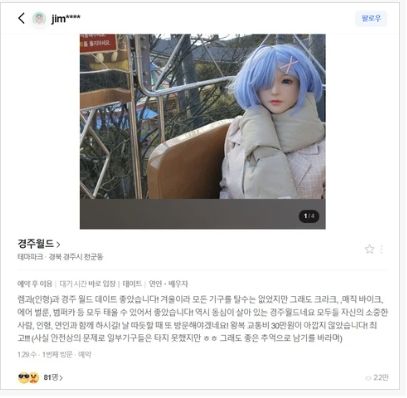 Hôm 29/1, chủ tài khoản @jim**** đăng bài đánh giá có tiêu đề “Tôi rất thích buổi hẹn hò của mình với Rem tại Gyeongju World!” trên Naver - nền tảng trực tuyến lớn nhất Hàn Quốc. Người này chia sẻ kèm 3 bức ảnh và một video về con búp bê trên các trò chơi tại công viên giải trí ở thành phố Gyeongju, tỉnh Gyeongsang Bắc.