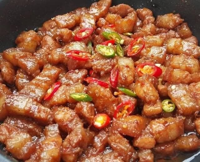 Khi thịt mềm, cạn bớt nước thì bạn tắt bếp, rắc ít hạt tiêu lên bề mặt thịt rồi lấy ra đĩa, ăn với cơm nóng rất ngon.