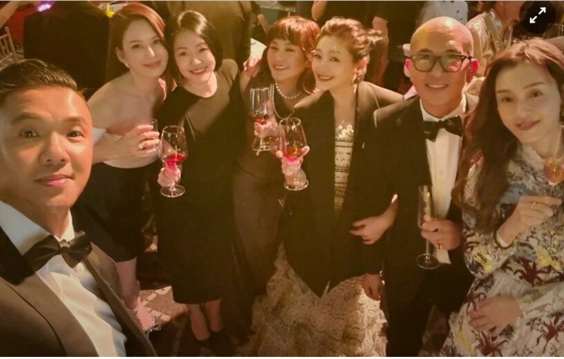 Trần Kiến Châu (ngoài cùng bên trái) chụp ảnh cùng vợ chồng Từ Hy Viên tại lễ cưới con gái của Vương Vỹ Trung. Ảnh: China Times.