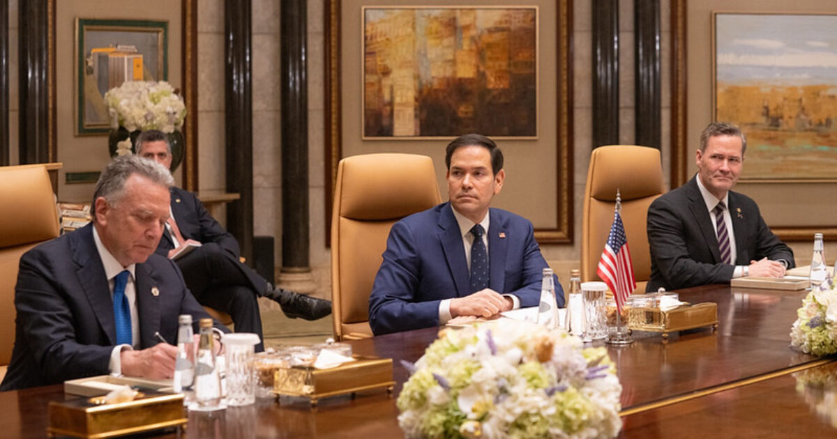 Ngoại trưởng Marco Rubio, từ trái sang phải, đặc phái viên Hoa Kỳ về Trung Đông Steve Witkoff và Cố vấn An ninh Quốc gia Mike Waltz, tham dự một cuộc họp tại Cung điện Diriyah ở Riyadh, Ả Rập Xê Út, ngày 18 tháng 2 năm 2025. (Ảnh chính thức của Bộ Ngoại giao do Freddie Everett chụp)