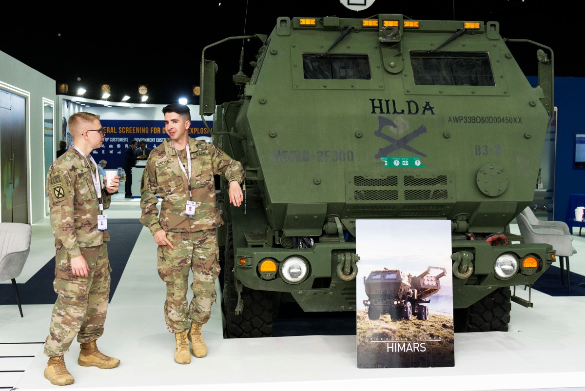 Quân nhân Mỹ đứng cạnh xe phóng đạn của tổ hợp pháo phản lực HIMARS tại triển lãm.
