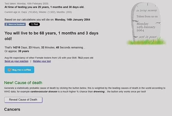 Sau khi điền đủ các thông tin, người dùng có thể được cung cấp dự đoán về nguyên nhân tử vong, tuổi thọ của bản thân so với những người khác cùng giới tính và chỉ số khối cơ thể (BMI) như thế nào.