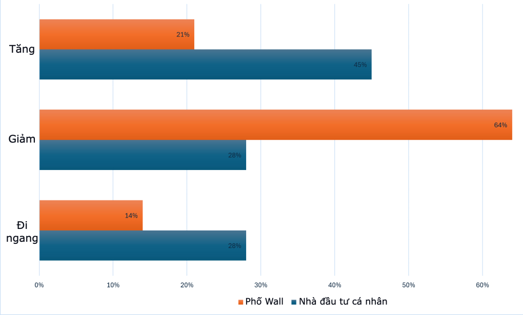 Các nhà đầu tư cá nhân cũng không nhiều lạc quan. Trong 138 người tham gia bình chọn trực tuyến, 62 người (45%) kỳ vọng tăng. Ngược lại, tỷ lệ đoán giá giảm và đi ngang cùng ở mức 28%.