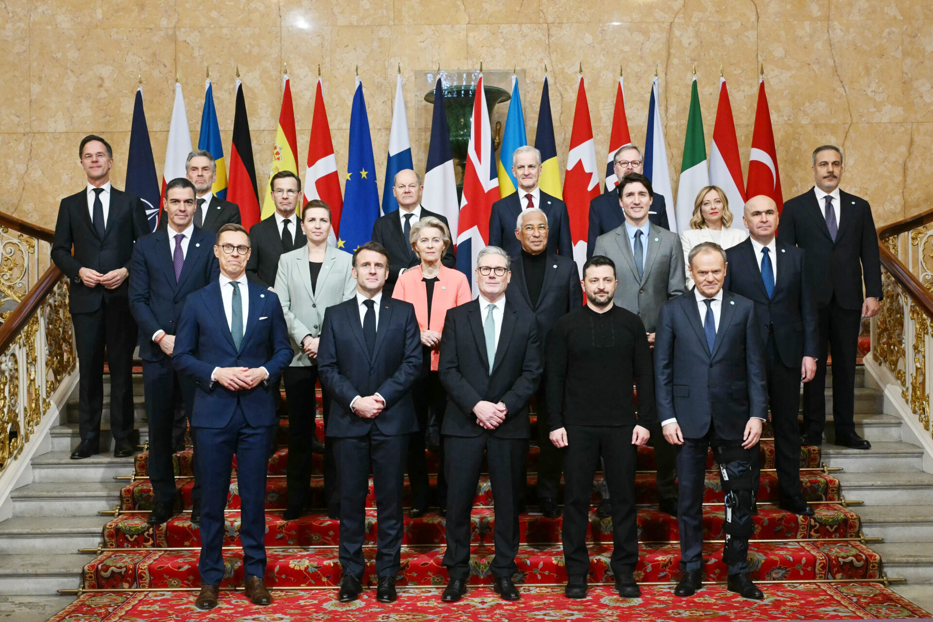 Ông Volodymyr Zelensky (hàng đầu, thứ hai từ phải), tổng thống Ukraine, chụp hình cùng các nhà lãnh đạo Âu Châu trong cuộc họp ngày 2 tháng Ba ở London, Anh, họp bàn về kế hoạch ủng hộ cho Ukraine. (Ảnh: Justin Tallis–WPA Pool/Getty Images)