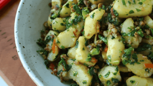 Điểm hấp dẫn nhất của món ăn này chính là bộ ba trải nghiệm hương vị. Những miếng củ mã thầy lăn trong chảo nóng, vẫn giữ được độ giòn, ngọt. Khi cắn, có tiếng "rồm rộm", nước ngọt lan tỏa trên đầu lưỡi. Lúc này, mùi thơm nồng nàn của rau cải dại (rau tề thái) lặng lẽ lan tỏa, hòa quyện với mùi mỡ từ thịt băm, như thể gói trọn hơi thở của cánh đồng đầu xuân và sự thỏa mãn khi được sưởi ấm dạ dày. Ớt chuông đỏ thái nhỏ rắc ở cuối là điểm nhấn hoàn thiện. Nó không chỉ khiến toàn bộ món ăn trông giống như một bảng màu bị lật ngược mà vị cay nhẹ cũng làm nổi bật hương vị ban đầu của các thành phần.