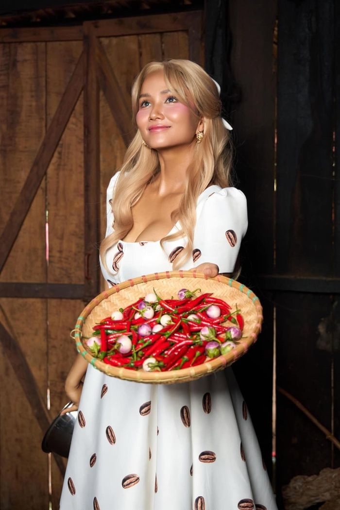 Trong loạt ảnh bình dị, H'Hen Niê diện một chiếc váy trắng với họa tiết hạt cà phê độc đáo. Thiết kế của trang phục mang phong cách cổ điển với phần cổ vuông giúp tôn lên vòng một gợi cảm, tay áo ngắn có độ phồng nhẹ tạo nét thanh lịch và nữ tính. Phần eo được chiết gọn, tôn lên vóc dáng không chút mỡ thừa của người đẹp.