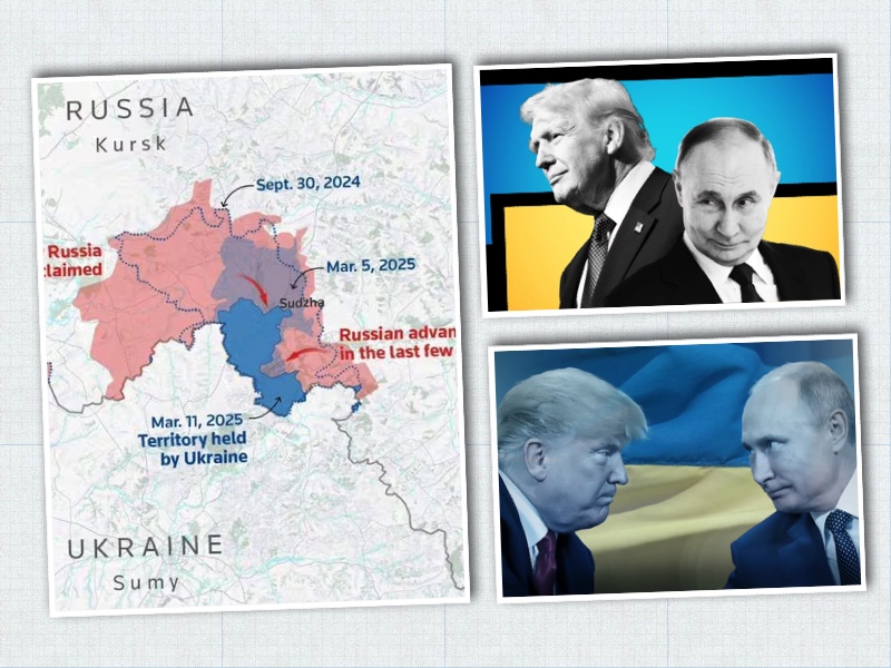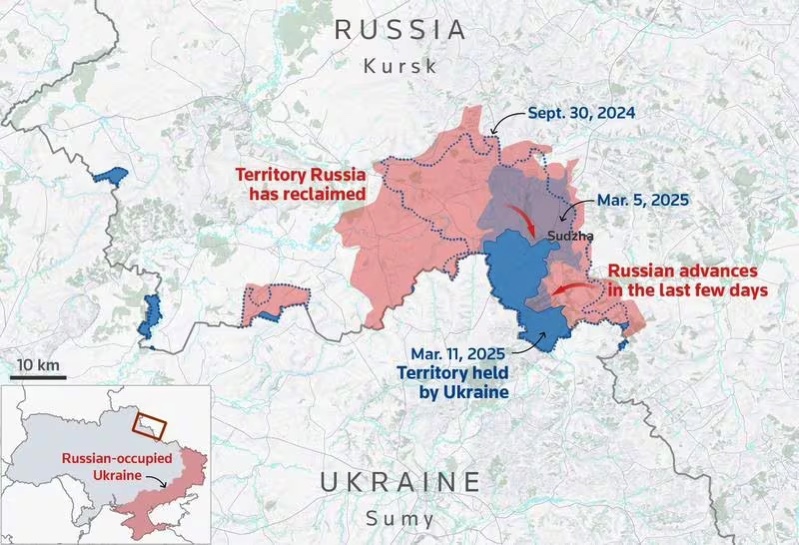 Tổng thống Donald Trump đă gây sức ép rất lớn để buộc Ukraine phải đồng ư ngừng bắn, yếu tố dễ thấy nhất trong số đó là thông báo tại Nhà Trắng hai tuần trước, sau khi căng thẳng nổ ra, rằng Hoa Kỳ đă ngừng mọi hỗ trợ quân sự cho Ukraine. Đổi lại, Ukraine ngay lập tức mất đi phần lớn sự hỗ trợ t́nh báo của Mỹ, tiền tuyến Kursk sụp đổ chỉ trong chốc lát, quân Nga chiếm lại hơn chục khu định cư trong một tuần và giờ đây có vẻ như họ đă chiếm được cả Sudzha.
