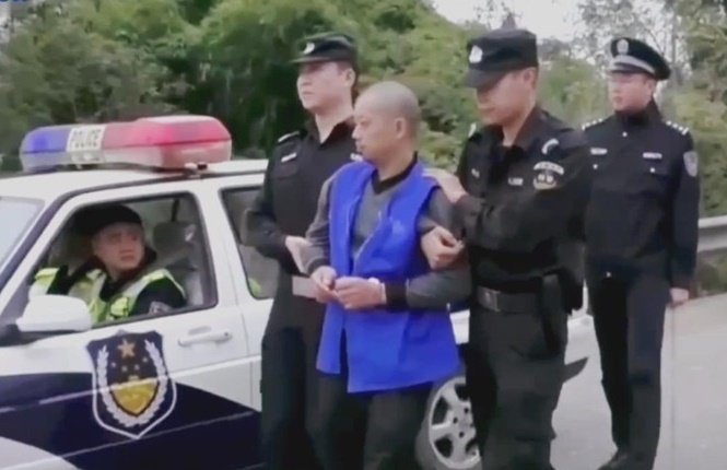 Dương Khôn bị áp giải đến hiện trường phi tang xác nạn nhân. Ảnh: Toutiao