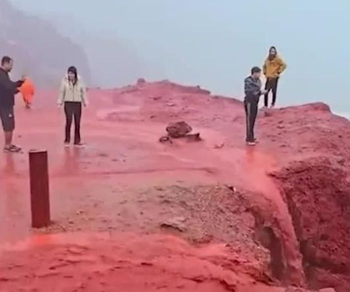 Trong đoạn video, những dòng nước màu đỏ chảy từ vách đá ven biển xuống đại dương trong cơn mưa xối xả, trong khi du khách mặc áo mưa tụ tập để chiêm ngưỡng hiện tượng kỳ thú này. Một video khác cho thấy một người đàn ông lội xuống bờ biển đỏ rực, trông giống như một hình ảnh được tạo ra bởi AI, càng khiến người xem kinh ngạc.