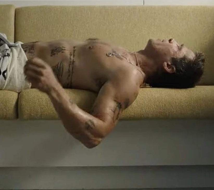Trong đoạn giới thiệu, nhân vật của Pitt có cảnh hôn nồng nhiệt với bạn diễn Kerry Condon (người Ireland). Tài tử 62 tuổi còn khoe hình thể săn chắc cùng loạt hình xăm cá tính ở một cảnh cởi đồ. Có chữ viết chi chít trên ngực và cánh tay của Pitt khi anh mặc chiếc quần tây màu trắng ngà và ngả người trên ghế sofa.