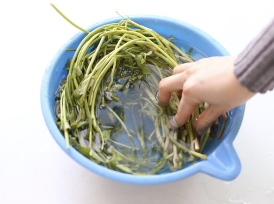 - Các cành rau nhỏ như rau muống, xà lách xoong, rau đắng...: phải rửa nhiều lần, sau đó rửa từng mớ nhỏ bằng nắm tay dưới vòi nước. Sau khi rửa rau dưới vòi nước xong có thể đem rửa lại rau trong chậu 1 – 2 nước nữa. Để loại bỏ các khuẩn tả thì sau khi rửa, có thể ngâm rau qua nước. Một chậu nước khoảng 10 lít, cho 1 thìa muối, rồi ngâm trong vòng 5 phút. Chị em lưu ý, không nên ngâm rau trong nước quá lâu vì sẽ làm mất một lượng lớn vitamin và khoáng chất.