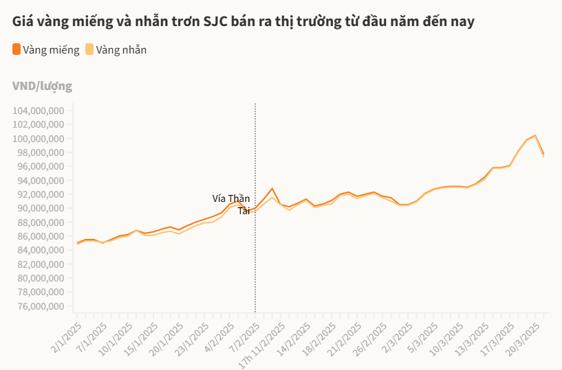 14h40, mỗi lượng vàng miếng được SJC giảm 3,1 triệu đồng ở chiều mua, xuống 94,7 triệu, còn chiều bán ra giảm 2,1 triệu đồng so với cuối ngày hôm qua, về 97,7 triệu. Chênh lệch mua bán nới rộng lên 3 triệu đồng một lượng. Nếu so với mức đỉnh thiết lập vào sáng qua, mỗi lượng vàng miếng hiện thấp hơn 2,7 - 3,9 triệu đồng.